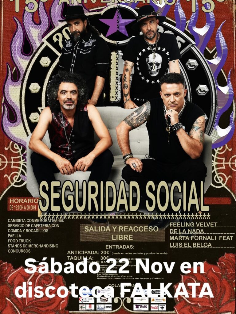 La asociación gandiense Alma de Acero lucha desde el año 2010 contra el cáncer infantil entre otras muchas causas ha organizado su XV festival ubicado en el recinto de Falkata en la playa de Gandia. El grupo estrella de su 15 aniversario será Seguridad Social, quienes actuarán a las 22h. El comienzo del festival será a las 12h del próximo sábado 22 de noviembre. Además actuarán los grupos Feeling Velvet, De la Nada, Marta Fornali feat Luis el Belga.